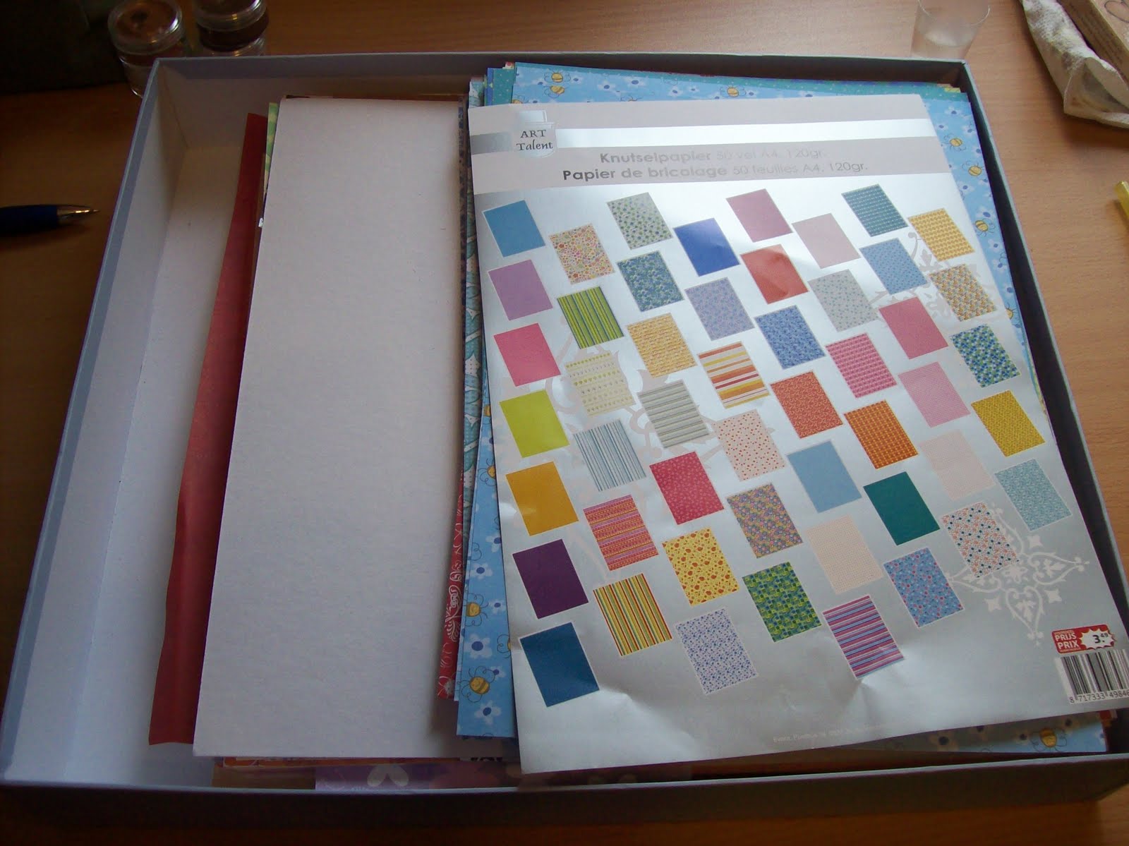 Donderdag met de zus naar A'pen getrokken voor de solden. Wat heb ik me daar laten gaan... aan knutselgerief welteverstaan! Bij Pippoos ook het laatste "Kadoosjes"-exemplaar gekocht! Om even een beeld te schetsen: links mijn doos met 30,5cm papier voor het shoppen, rechts mijn doos erna... met mijn nieuwe Artemioblok er bovenop. Zelfs mijn enveloppenbox krijg ik niet meer toe zoals je kan zien...